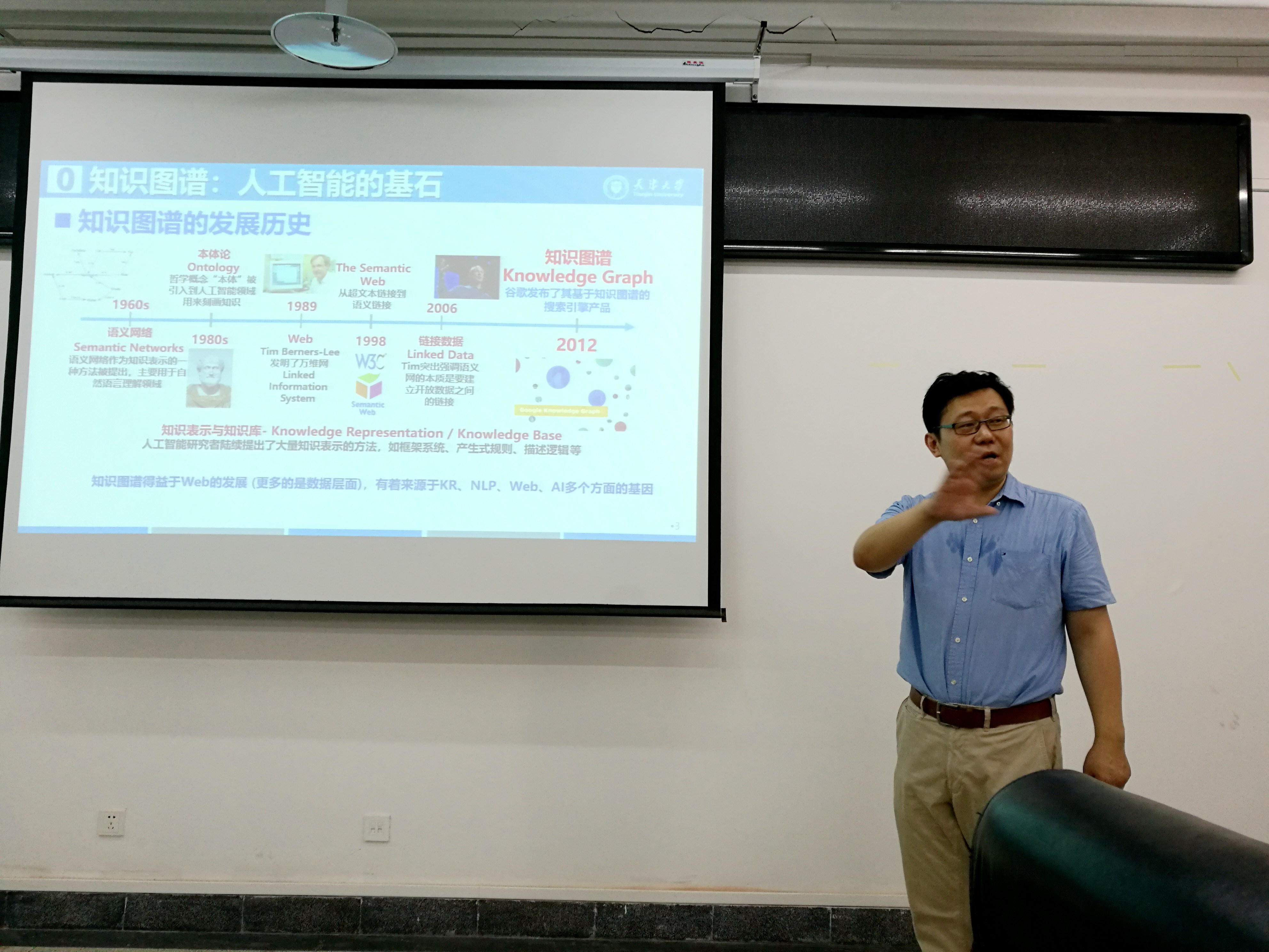 王鑫老师结合自身研究背景,首先介绍了知识图谱的发展历史和知识图谱数据管理的路线图。然后分别从知识图谱数据模型、查询语言、存储管理和查询处理四个方面详细介绍了知识图谱数据管理的新进展,并且展望了未来知识图谱的研究方向。报告结束后,师生就知识图谱相关内容与王鑫老师进行了热烈的讨论。虽然已经进入暑假,但是老师和同学们学习的热情依然很高。整个报告会持续近2个小时,内容丰富详实,加深了师生对知识图谱相关研究的认识和理解,受到一致好评。